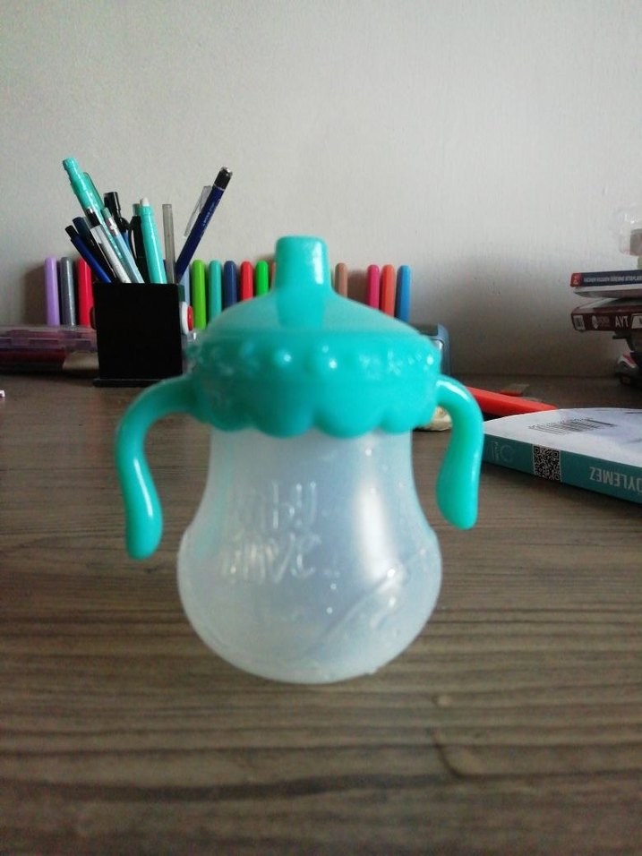 Turkuaz kapaklı, kulplu ve renkli tasarımlı bebek biberonu, küçük eller için kolay tutuş sağlar. Orjinaldir