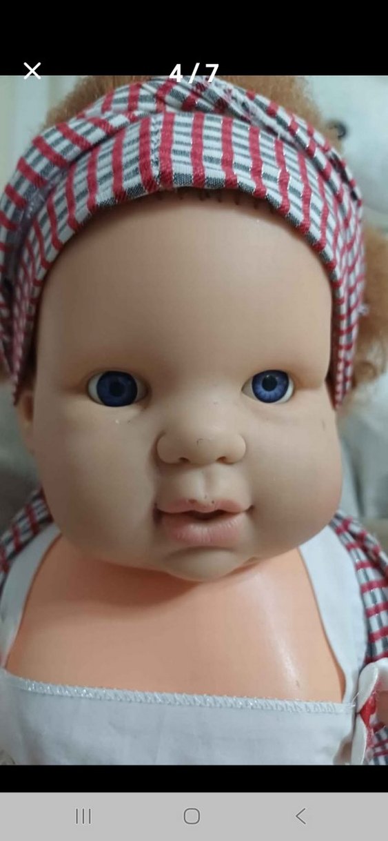 Mavi gözlü, çizgili bantlı, pastel tonlarda bej renkli oyuncak bebek. Yumuşak yüz hatları gerçekçi görünüm sunar. pilli konusan sevimli bebek