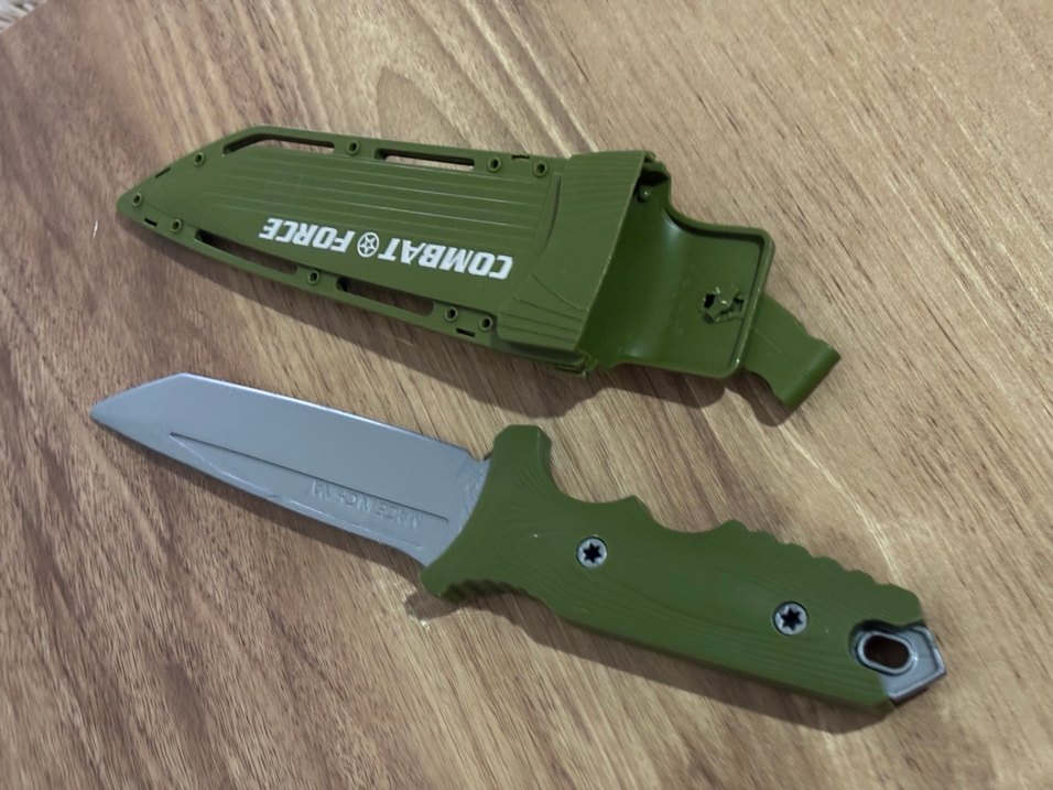 Khaki renkte Combat Force bıçak, sağlam sapı ve güvenli saklama için uyumlu kılıfı ile birlikte gelir. Oyuncaktır