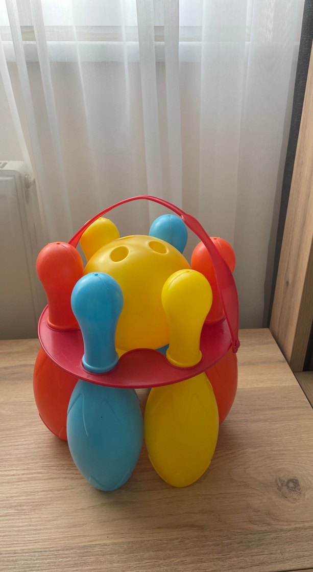 Taşınabilir saplı, çok renkli plastik bowling seti. Temizdir.