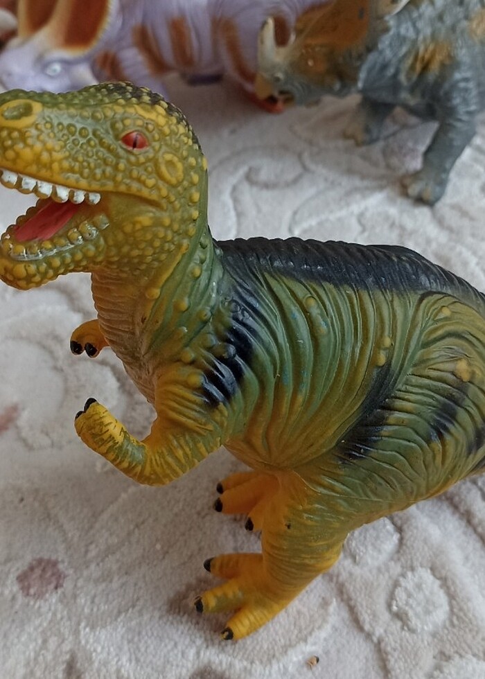4 adet dinozor. Yeşil olan yumuşak yapıda. Boyutları büyük.