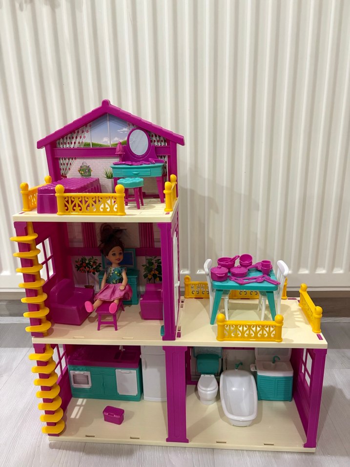 Çok katlı, mutfak, banyo ve oturma odası detaylı renkli pembe oyuncak ev. Küçük mobilyalarla oyun imkanı sunar. Ürünün kutusu yok . Hevesle almıştık ama çocuğum oynamadı malesef kırık vs hiç bi sorunu yok bütün parçaları tam