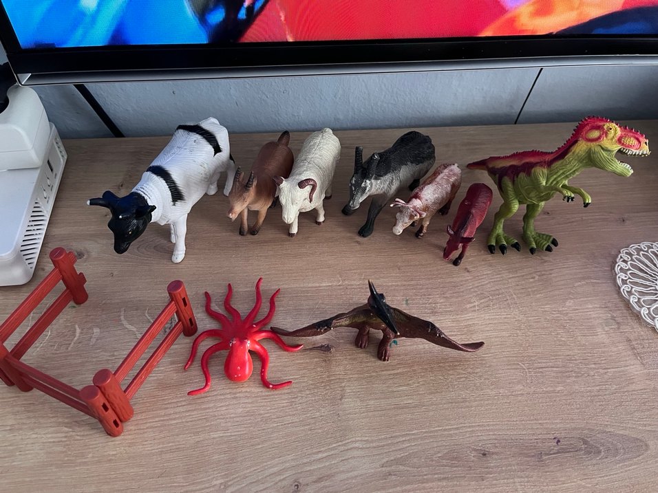 Kırmızı ahtapot ve kahverengi pterodaktil gibi çeşitli hayvan figürlerinden oluşan çok renkli bir set. Katı malzemeden yapılmıştır.