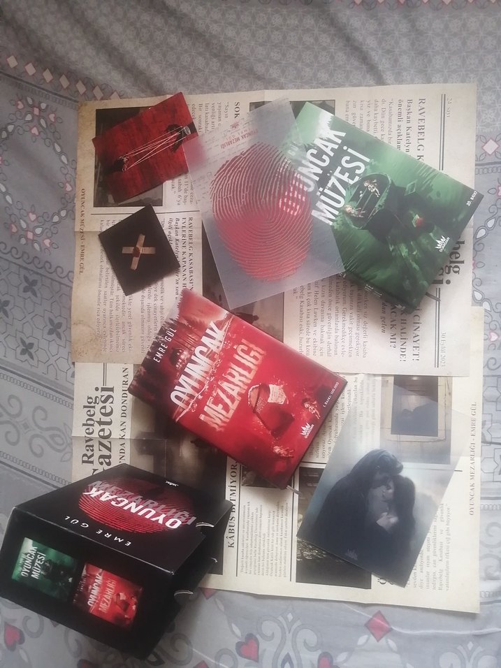 Oyuncak Müzesi ve oyuncak Mezarlığı kutulu ciltli şeffaf ayraçı var. Ayraçlı ve posterlidir. Resimdeki gibi dir. Altı çizili yeri yoktur. [Wattpad roman romantik polisiye tarih gelişim psikolojisi sanat yapı kredi iş bankası yayınları deneme fantastik Ephesus Epsilon Olimpus] Ravebelg'in "Oyuncak Müfettişi" ve "Oyuncak Mezarlığı" romanlarının bulunduğu kitap seti, gazete üzerinde sergilenmiştir.