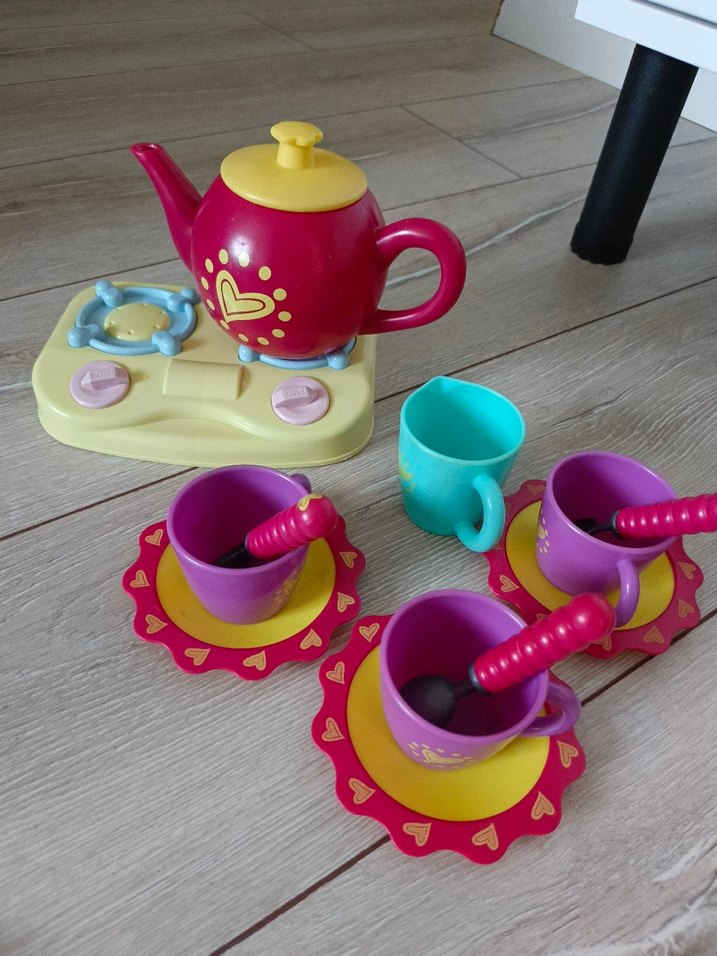 Renkli pembe çaydanlık seti, üç fincan, tabak ve oyuncak ocak içerir. Canlı ve eğlenceli tasarım.
