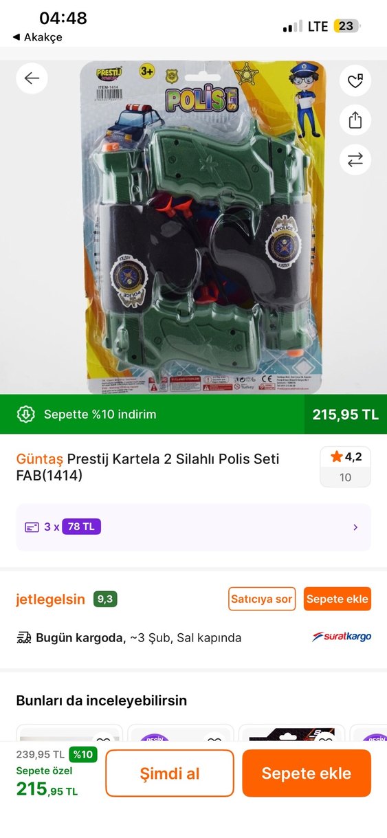 0 ve kutulu üründür.Ertesi gün kargoya verilecektir.İnternet fiyatının hep daha ucuzuna satışlar yapıyoruz. Bu oyuncak polis seti, iki koyu haki renkli oyuncak tabanca ve polis rozetleri içerir. Gerçekçi görünüme sahiptir ve kompakt ambalajda sunulur.