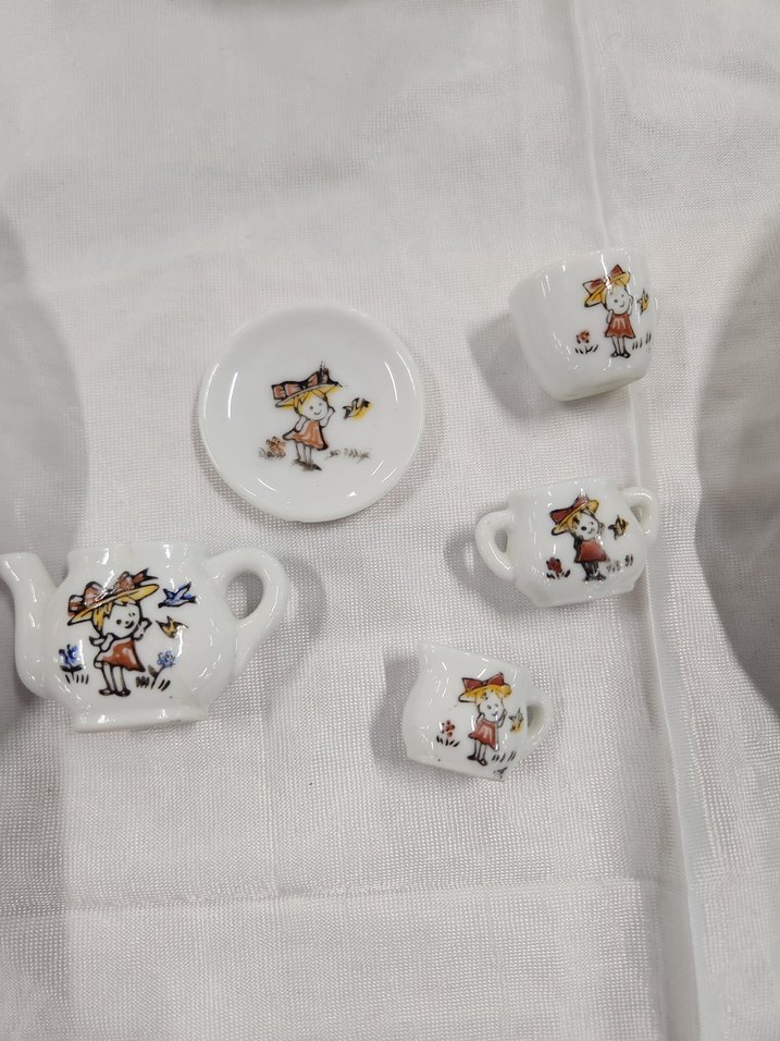 Renkli çizgi karakter baskılı beyaz mini çay seti; demlik, fincanlar ve tabaktan oluşur. Koleksiyonluk bir ürün. Bir adedinde çatlak var yapıştırıldı.