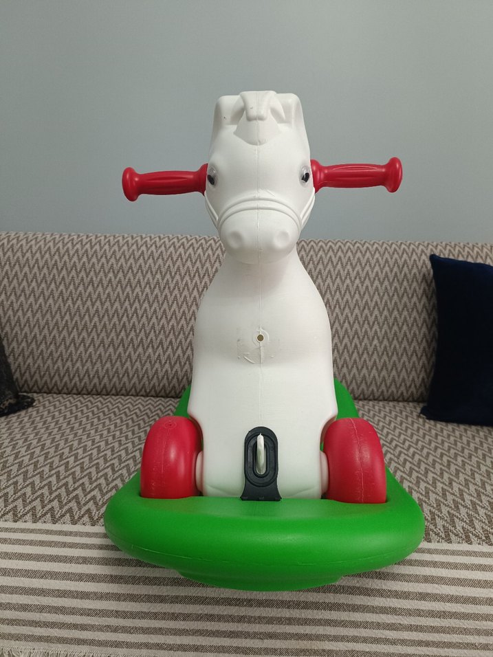 Renkli beyaz at figürlü çocuk oyuncağı, kırmızı tutacaklar ve tekerlekler ile yeşil taban üzerinde oturmak için uygundur. Tertemiz ürün Birkaç ay kullanıldı