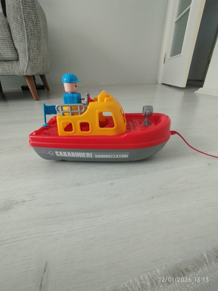 Bu renkli oyuncak tekne, kırmızı taban ve sarı ile mavi detaylara sahip. Küçük bir figür ve gerçekçi tasarım öğeleri içerir