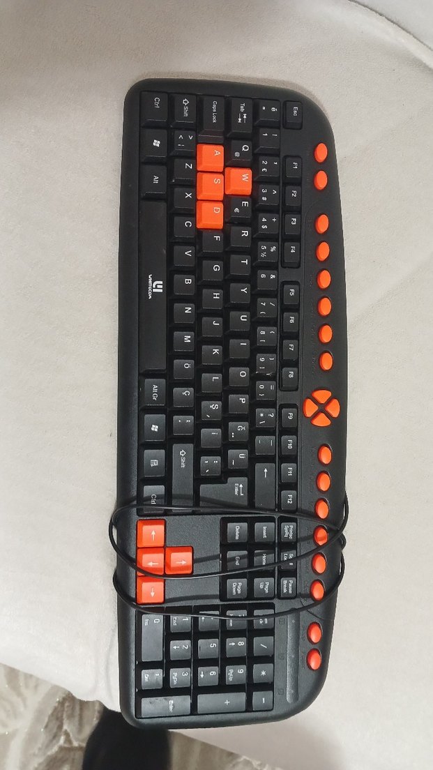 Turuncu detaylı WASD ve yön tuşları ile siyah kablolu klavye, sağda turuncu fonksiyon tuşları ve standart tuş düzeni bulunur. ️