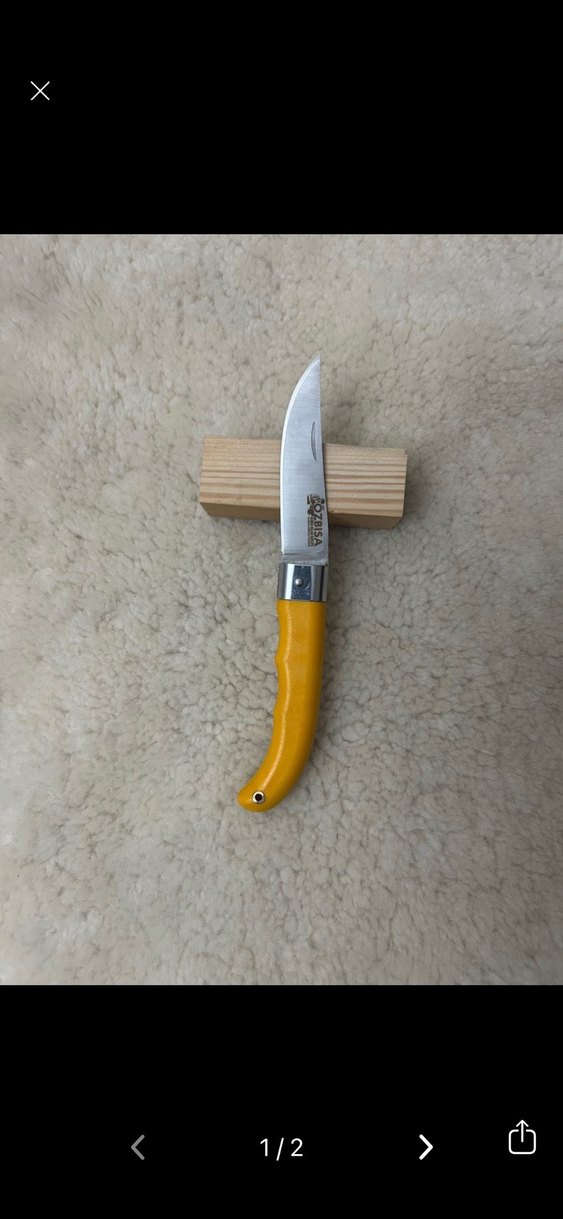 Hafif sarı sapı ve keskin paslanmaz çelik bıçağı olan katlanabilir bıçak.