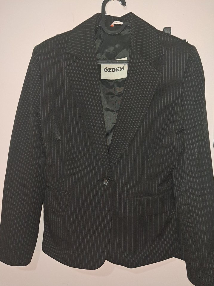 Özdem markalı siyah çizgili blazer ceket, düğmeli ve uzun kolludur. Normal boy ve regular fit kesimlidir, ofis ve sokak stili için uygundur. iki kol arası 43cm boy 60cm