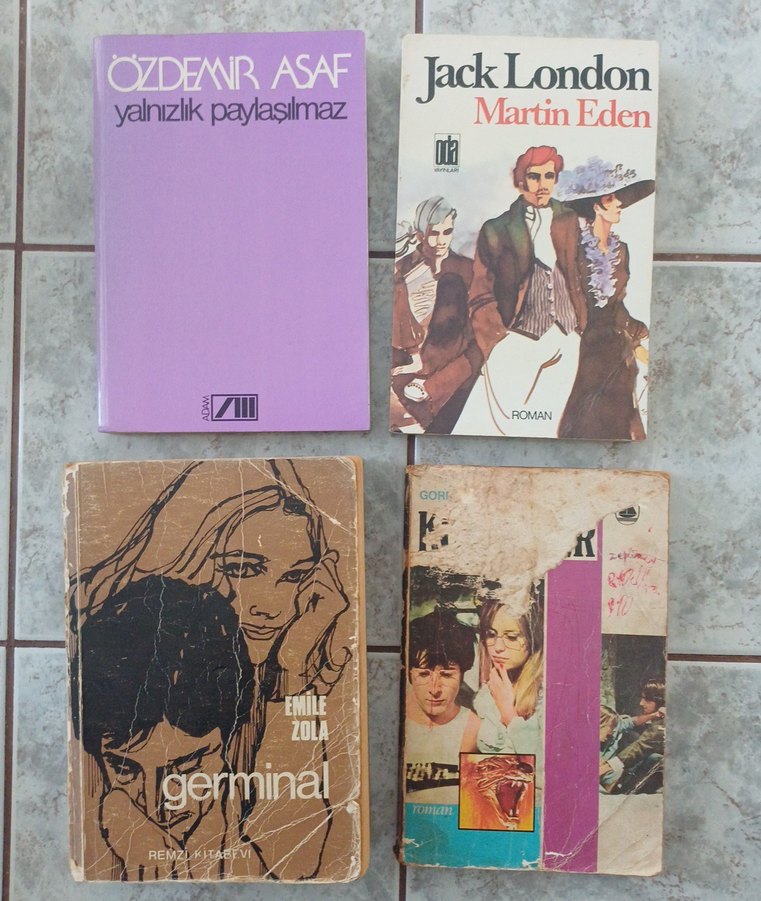Özdemir Asaf, Jack London ve Émile Zola'nın romanları dahil dört klasik kitap, farklı kapak tasarımlarıyla.