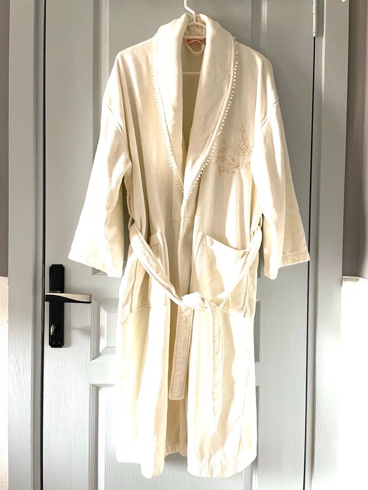 İşlemeli detaylara sahip, bohem tarzda kırık beyaz bornoz, konfor için kemer ve cepler içerir.