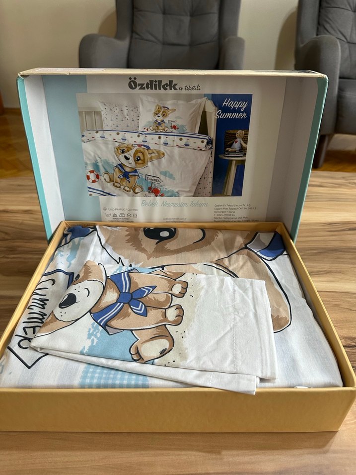 Ürün kutusundan dahi çıkmadı, sıfır, kusursuz. Özdilek markasına ait, açık mavi renkli, pamuk kumaştan yapılmış, sevimli köpek desenli bebek nevresim takımı.
