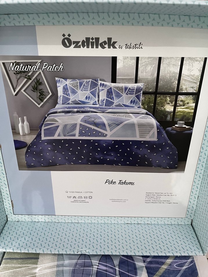 Özdilek Natural Patch mavi ve gri tonlarda baskılı desenli pike takımıdır, yatak odanıza sakin ve modern bir hava katar.