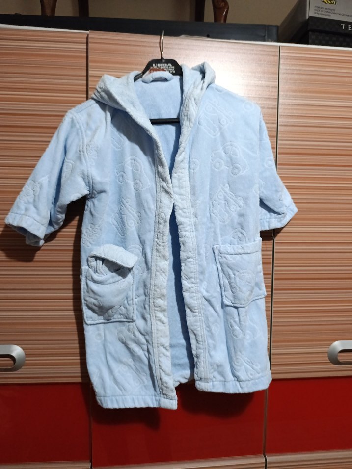 Pastel mavi renkte, kapüşonlu ve iki ön cepli yumuşak dokulu erkek çocuk bornozu.