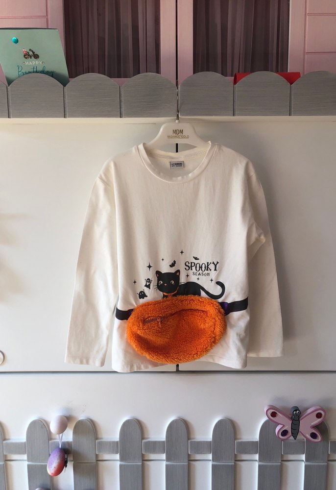 Beyaz renkte, siyah kedi baskılı ve "SPOOKY" yazılı kedi kıyafeti. Turuncu cepli kemer detayı bulunur. Streetwear tarzı. Kızım sadece bir kere kostüm partisinde giyindi temizdir ütülüdür önündeki turuncu bölme fermuarlıdır içinde birşeyler konuşabilir biz şeker koymuştuk