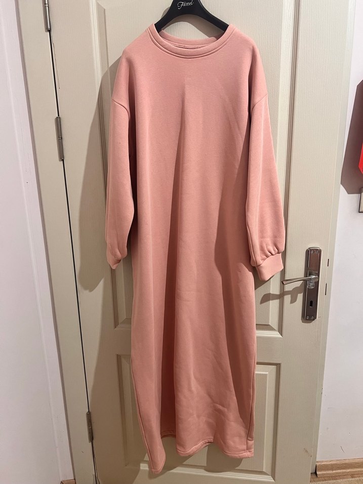 Pembe renkli, uzun kollu, yuvarlak yaka ve bol kesim kadın triko elbisedir. Yumuşak ve sıcak kumaştan yapılmıştır, günlük kullanım için uygundur.