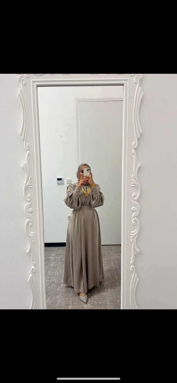 Yüksek yakalı, uzun kollu, bol kesim uzun elbise. İpek gibi kumaş ve şeffaf detaylarla, açık gri renk ve etnik desenli, düğün ve günlük kullanıma uygun.
