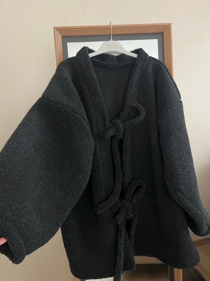 Siyah, yumuşak dokulu midi uzunlukta, bol kesim ve askılı bağlamalı kadın bornoz. Rahat ve desen içermeyen tasarım.