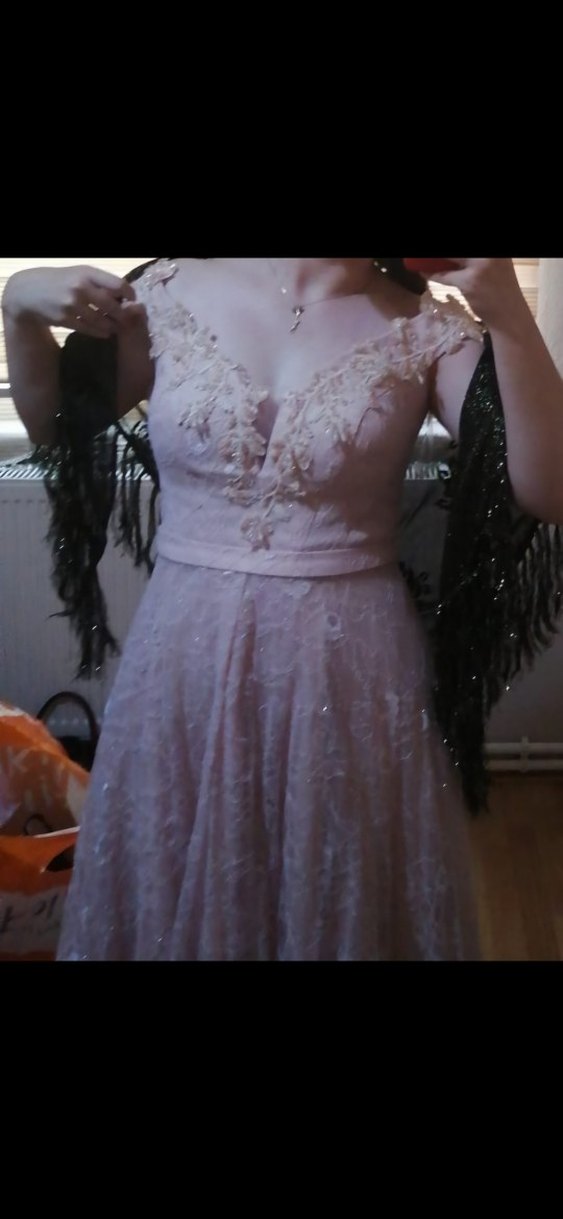 Pembe renkte, V yakalı ve dantel detaylı, klasik şıklıkta vintage esintili, ince askılı ve normal boy midi elbise. 38 bedendir.1 kere kullandım sıfır ayarındadır