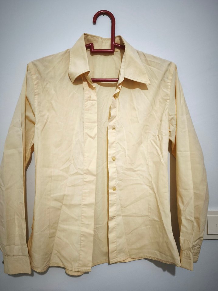 Bej uzun kollu kadının düğmeli, yakalı gömleği, yumuşak keten kumaştan, regular fit ve minimal tasarımlı, ofis ve sokak stiline uygun.