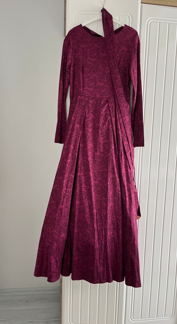 Bordo uzun elbise, drapeli detaylar ve yüksek yakaya sahip. İpeksi kumaştan, uzun kollu ve bohem vintage tarzında, ofis için uygun.