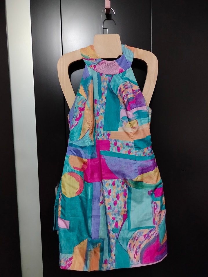 Kolsuz, halter yaka, tam kalip, pastel bağlama desenli çok renkli kumaştan, parti tarzına uygun.Bir davet için, ozel olarak diktirilmistir, 1defa giyildi. tafta kumaştan dikilmiştir. Tam kaliptir.