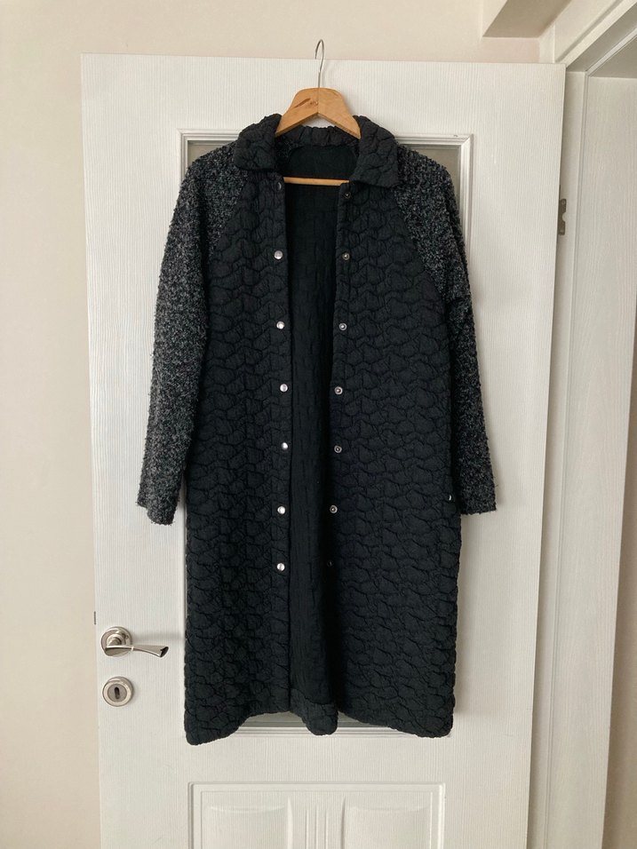 Düğmeli, uzun kollu ve yaka detaylı kadın uzun kaban. Yumuşak penye ve triko kumaştan, rahat kesim ve siyah-gri renklerde. Günlük kullanıma uygun şık ve konforlu bir model.