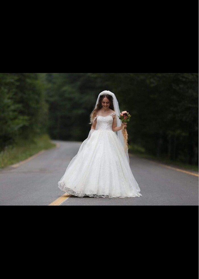 Özel dikimdir. A kesimdir. 48 kiloda giyilmiştir. Tarlatan ve duvağıyla beraber gönderilecektir. Kuru temizlemesi yapıldı fakat baza altında durmaktan tarlatanında hafif lekeler oluşmuştur.