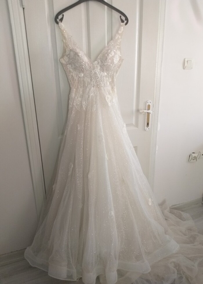 Çok iyi durumda özel dikim taş işlemeli şık modern tasarım gelinlik bir kez giyildi.Tarlatanı duvağı dahil