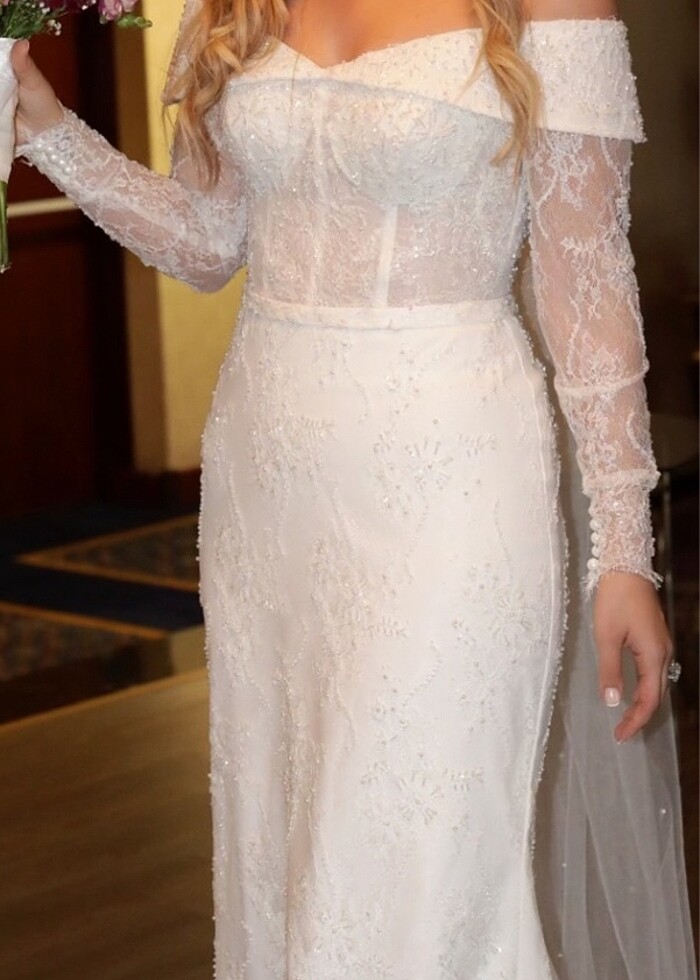 Özel dikim 38-40 beden kayık yaka omzu açık, transparan kol gelinlik, duvağım 260 cm taşlı incili hediye göndereceğim, 170 cm , 64 kg iken giydim