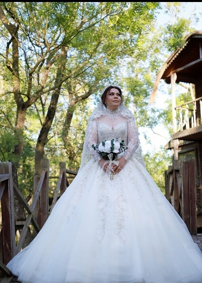 Özel dikim 38.40.42 beden uyumlu arkası ipli ayarlanabilir inci detaylı tamamen el iççiligi muazzam bir görselliği var duvagida Özel tasarım bir kere düğünde giydim hiç bir kusuru yok htiyactan dolayı satilik tacını hediye edicem alicisina hayırlı olsun.