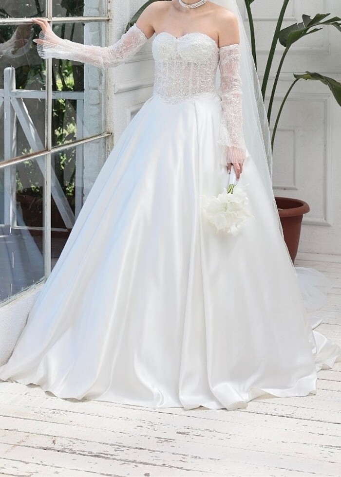Özel dikimdir 36 beden arkası bağcıklı ayarlanabilir Duvak hasarlı olduğu için duvaksız eldivenli şekilde teslim edilecektir. Üst beden başenli Fransız dantel etek tamamı satendir. Astarlıdır ve tarlatanı vardır. Marka temsilidir.