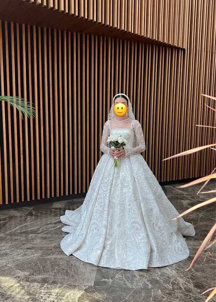 Özel dikim gelinlik. Her hangi bir deformesi yok kuru temizleme yapılarak gönderilecek. Duvagı ve çantası mevcut. Kabarık kuyruklu bir model. Markası Misch. Ben 58 kilo 1.70 boyunda düz ayakkabı ile kullandım. Danteli full işmele ve taş.