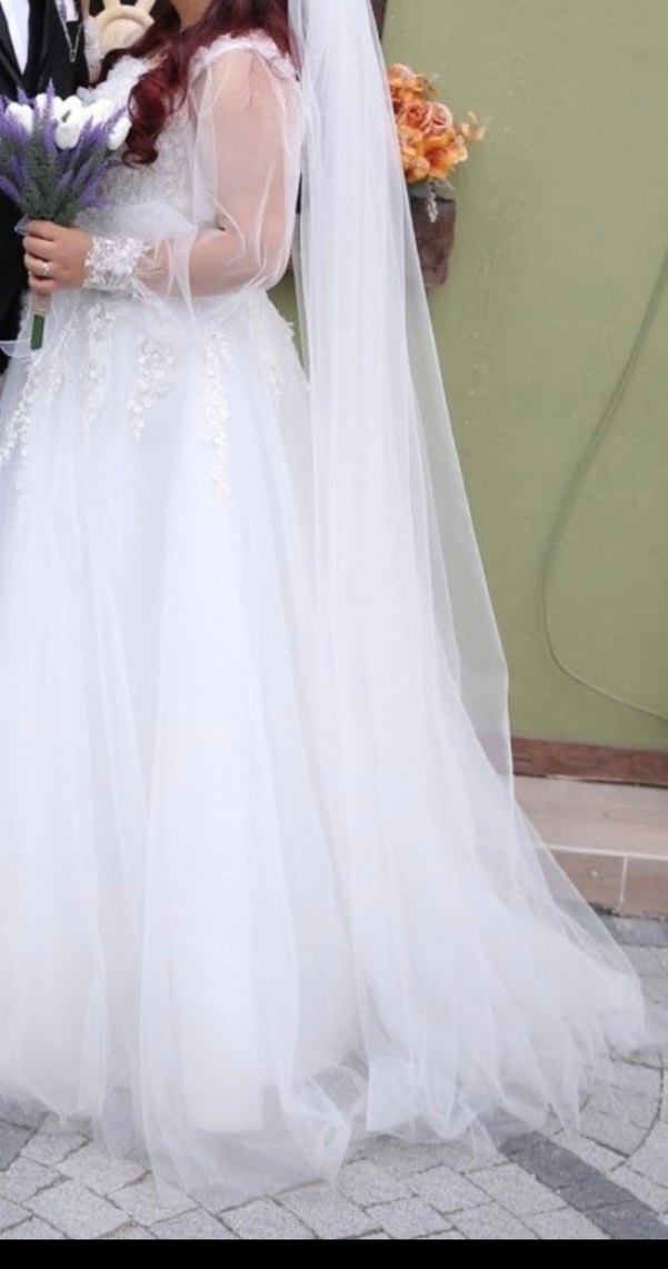Bu beyaz A kesim gelinlik, uzun kollu ve straplez yakaya sahip olup klasik zarafeti bohem dokunuşla birleştirir. İnce detaylara ve uzun bir kesime sahiptir.