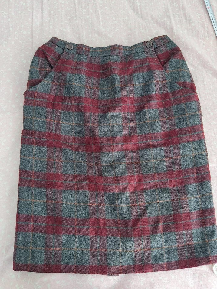 Düğmeli detaylı, bordo ve gri kareli vintage desenli, bol kesim midi uzunluğunda hamile eteği. Günlük kullanıma uygundur. boy 59cm bel 45 cm