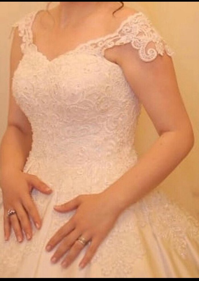 Uzun beyaz prenses gelinlik straplez yaka ve ince askılı kollara sahiptir Düzenli kalıp ve modern klasik tarzda zamansız bir gelinliktir