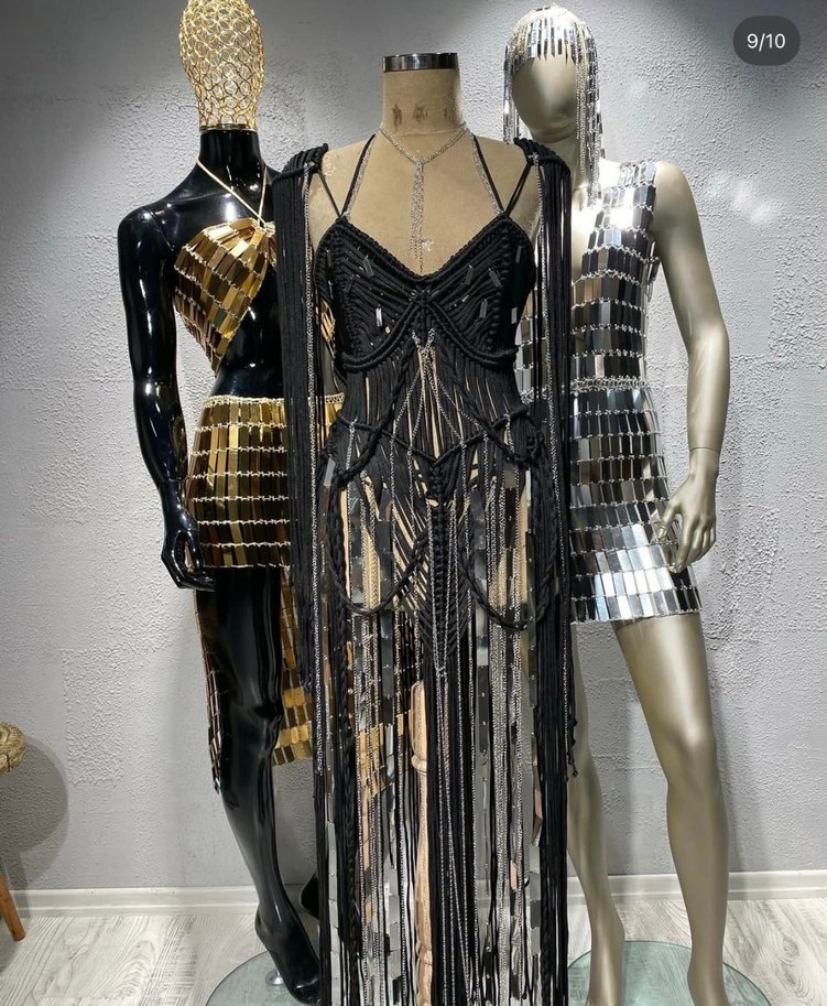 Siyah, straplez ve ince askılı, payetli ve desenli uzun, vücuda oturan kadın abiye elbise, parti için uygun. ✨