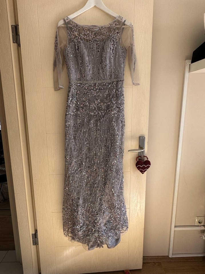 Özel dikim işlemeli gri abiye tuvalet, iki koltuk arası 39 boyu 145 cm dir