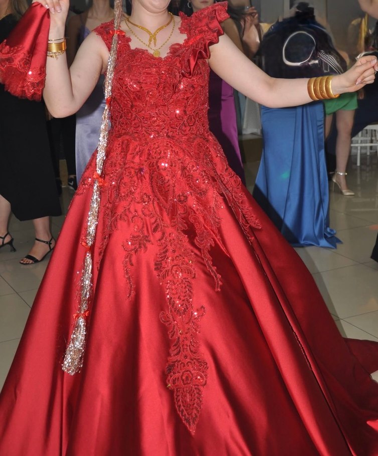 Uzun kuyruklu, yakası bir taraf 3 boyutlu diğer taraf askılı, işlemeli ağır model kınalık. Sadece 1 defa giyilmiştir. Kendi kınam için özel olarak kumaşını alıp diktirdim. Kına boyunca 5 tane elbise değiştirdiğim için en fazla 1 saat üzerimde kaldı sadece. Sıfır denilebilecek şekildedir. İsteyene mendili ile birlikte gönderebilirim. Arkası ipli olduğundan 40-42-44 beden aralığına olur.