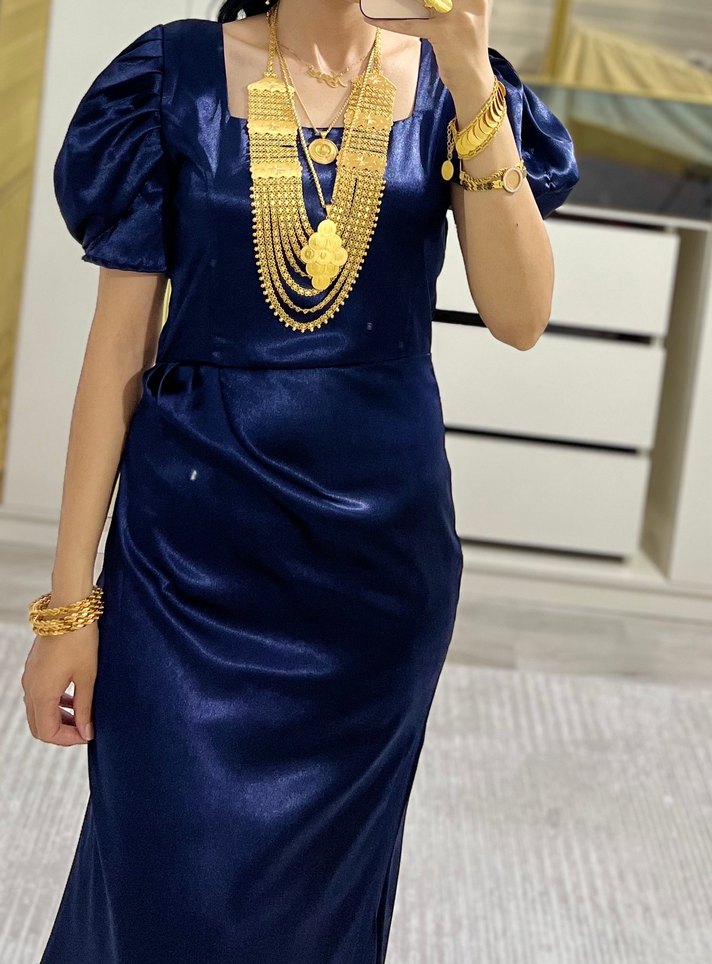 Özel dikim saten lacivert uzun abiye M bedene uygun deformesiz