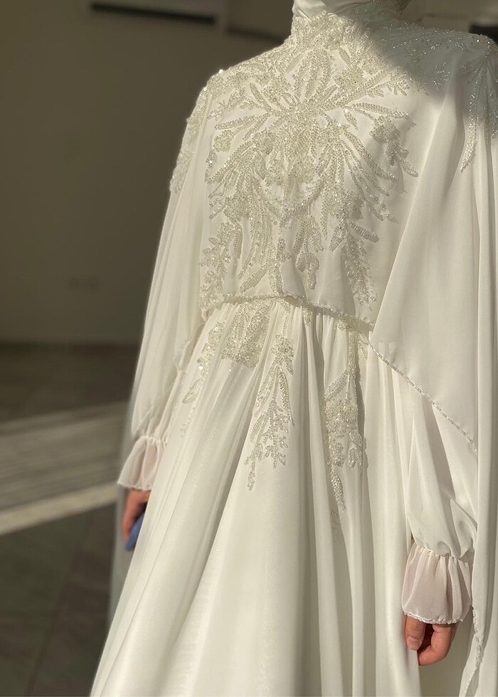 Kuru temizlemesi yapıldı.Tertemiz ve tesettüre uygun bir gelinliktir.38-40 beden uyumludur.Göğüs genişliği 44 cm,bel genişliği 37 cm’dir.Boyu 150 cm.Arkası fermuarlıdır.