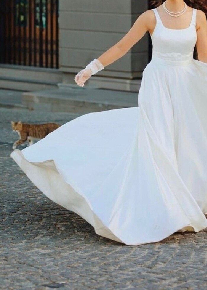 Ekim ayında sadece nikahımda birkaç saat giydim. Özel dikim gelinliktir. 36-38 beden için uygundur. Kullanım sonrası temizliği yapılmıştır. Çok kabarık olmayan, helen tipi tarlantansız model saten bir gelinlik. Arkasında hem fermuarı hem aynı kumaştan düğmeleri mevcuttur. Tak çıkar şeklinde fiyonk detayı vardır istenmediği takdirde çıkarılabilir.