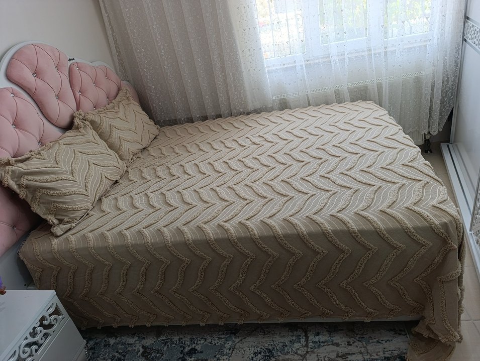 Bej renkli, dalga desenli dokulu yatak örtüsü, yatak odanıza şık ve rahat bir görünüm kazandırır. Yumuşak ve konforlu kumaş.