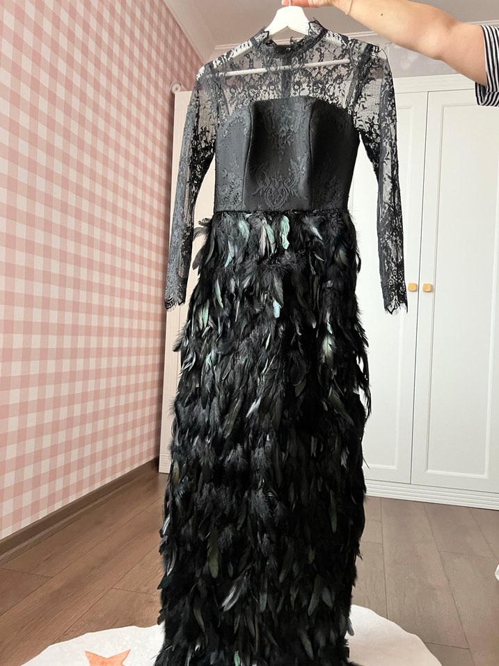 Dar kesim siyah abiye, dantel uzun kollu ve askısız üst kısmıyla, tüy detaylı eteğe sahip avant-garde parti elbisesidir.