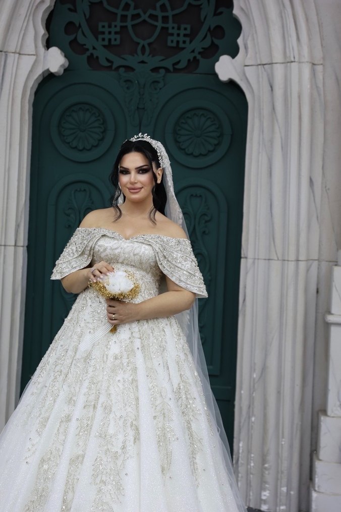 Beyaz prenses gelinlik, straplez yaka ve kısa kollu, bol kesimdir. Özel zarafeti modern tarzla buluşturan gösterişli bir tasarımdır.