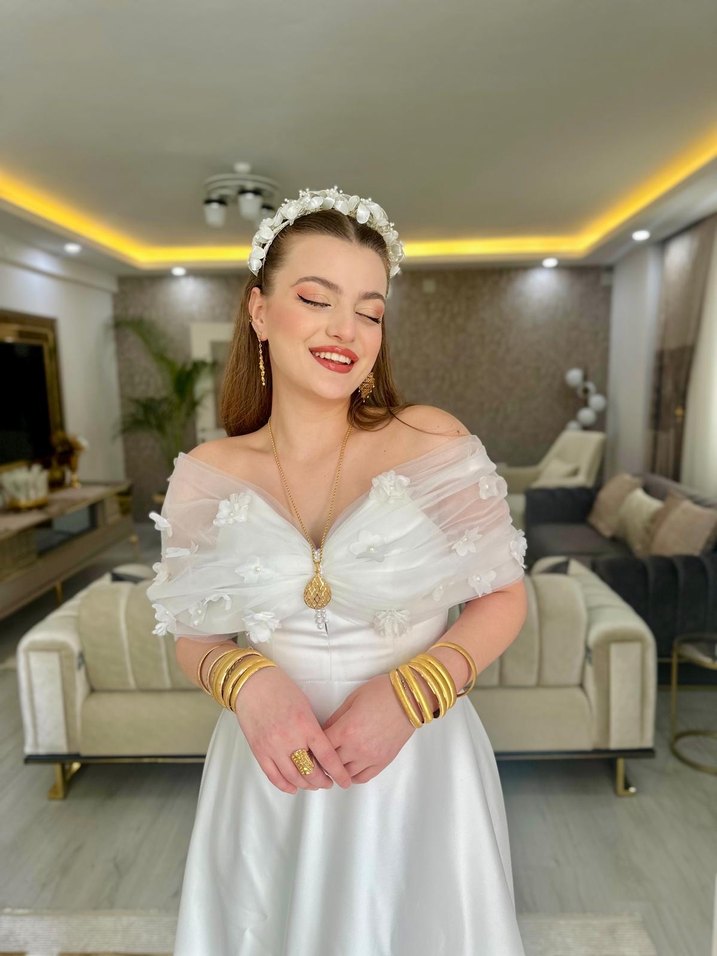 Uzun, beyaz A-kesim gelinlik, straplez yaka ve askılı kollarla klasik zarafeti bohem tarzıyla buluşturuyor. Sorunsuz özel dikim elbise. Marka temsilidir 36-38 uyumludur