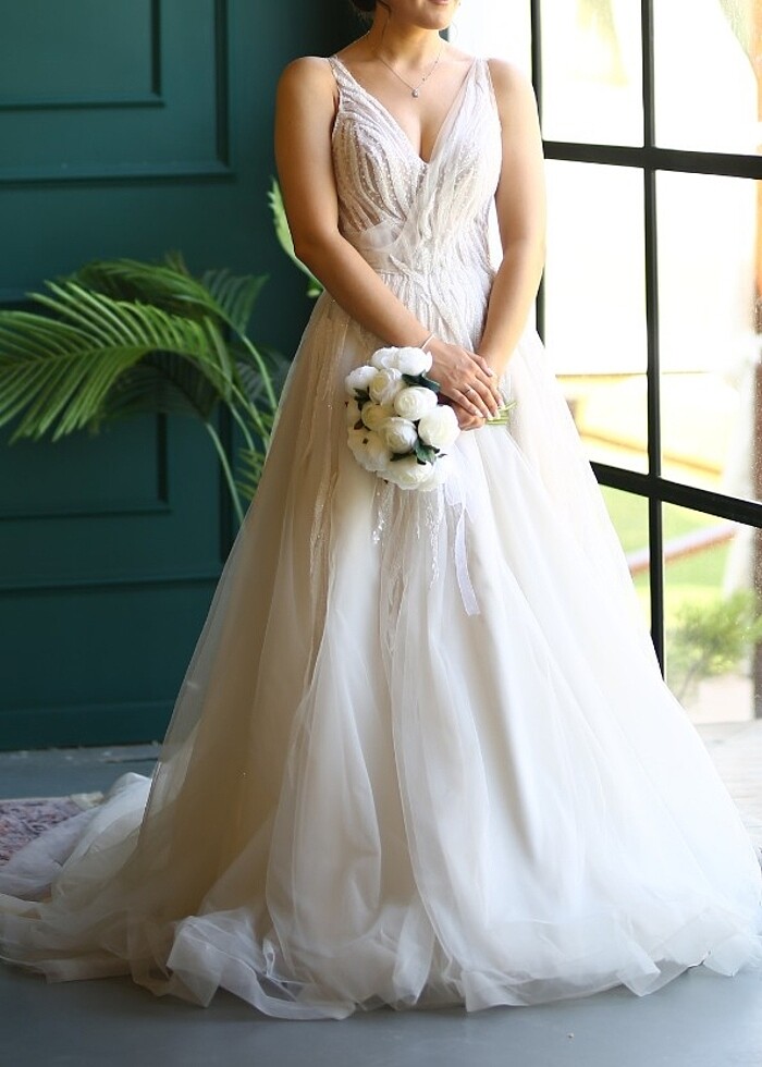 iki defa kullandım. dış çekimim ve düğünümde. kuru temizlemesi yapılmıştır. özel dikim tasarım gelinliktir. uzun ve kısa duvağı mevcuttur. yürüme tarlatanı da vardır. 160 boy 55 kilo. hiçbir defosu ve lekesi yoktur. pazarlık payı mevcuttur